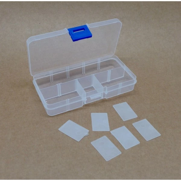 Boite de rangement 13cm X 6,5cm X 2cm pour perles, scrapbooking, barette, collier, bracelets, bouton, couture, créations diversesCette boite de rangement peut contenir 10 cases de 2,4cm x 2,8cm, les séparations sont amovibles excepté 2 qui sont fixes (cf photo), de ce fait cette boite est très pratique et ajustable aux perles ou objets à ranger…Longueur13cmLargeur6,5cmHauteur2cmColoristransparent, incoloreMateriauplastiqueVendu à l’unité, le prix indiqué est pour une boite de rangements de 4 compartiments à 10 compartiments.N’hésitez pas à me contacter pour tous renseignements