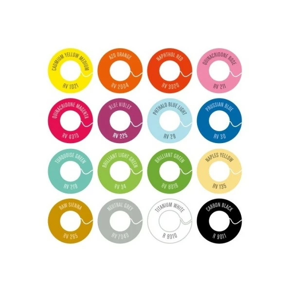 - Assortiment de couleursCadmium yellow medium- RV1021; AZO orange- RV2004; Naphthol red- RV3020; Quinacridone rose- RV211; Quinacridone magenta- RV4010; Blue violet- RV225; Phthalo blue light- RV29; Prussian blue- RV30; Turquoise green- RV219; Brillant light green- RV34; Brillant green; RV6018; Naples yellow- RV135; RAW sienna- RV265; Neutral grey- RV7040; Titanium white- R9010; Carbon black