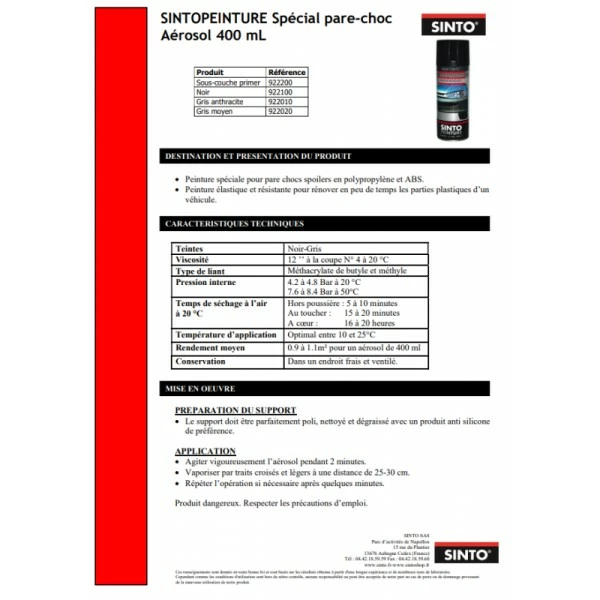 Données techniques pour Bombe de peinture pour pare choc – sous couche – Sinto